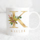 Un tazón de café personalizado con una letra falsa de oro "K" monograma, con ilustraciones decorativos de acuarela floral y follaje. Personalizar fácilmente con tu nombre o crea un regalo único para tus seres queridos.