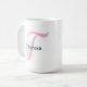 Esta taza de cerámica blanca presenta un monograma "T" rosa dulce con un guión elegante, con un nombre de marina editable para un toque personalizado. Un regalo perfecto para cualquiera cuyo nombre empiece con T, ya sea por un cumpleaños, una celebración o una sorpresa significativa. Explore la colección de Monogramas de Guión Rosa para encontrar cada letra.