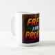 El diseño de la camiseta "Free and Proud" presenta un fondo vibrante y abstracto con patrones giratorios y líneas en negrita. Las palabras "Libre y Orgulloso" se exhiben de manera destacada en una variedad de colores brillantes y contrastantes, con tipografía detallada y letras nítidas y nítidas. El diseño es llamativo e impactante, transmitiendo un mensaje de libertad y autoexpresión.
