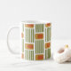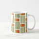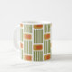 Esta taza tiene un diseño moderno de mediados de siglo, de cinco líneas verdes y un rectángulo dorado redondeado con un rectángulo redondeado naranja que se repite a lo largo del diseño.
