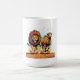 Vibrant comic-style duo of a roaring lion and nimble llama racing in bold colours, perfect for energetic streetwear and youth apparel, capturing motion and wild teamwork.