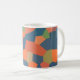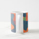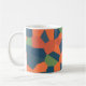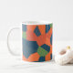 Un Coffee Mug llamativo, con un patrón abstracto en colores vibrantes - Naranja flamante, azul medio noche y verde profundo, de un diseño digital de Judy Adamson.