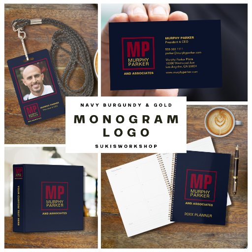 Personalizado fabrica sus propios productos promocionales, accesorios de oficina en este sencillo y clásico logotipo de la marina, borgoña y oro monogramado. Este logotipo monogramado es moderno, sencillo y audaz. Incluye dos iniciales de letras con nombres en la parte inferior, todos dentro de un cuadrado. Es profesional, versátil y fácil de personalizar para cualquier empresa o para uso personal.