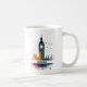 Un design abstrait, inspiré de l'art moderne, met en valeur la silhouette de Big Ben, soulignée de formes géométriques et de touches de couleurs vives parsemées sur la tour. Le ciel dégradé est remplacé par des aplats de couleurs dans un style pop art, conférant au design une allure dynamique. Des représentations abstraites de la Tamise sont suggérées par des lignes ondulées et des formes irrégulières à gauche, tandis que les pavés à la base sont minimalistes et anguleux. Le mot « LONDON » s'affiche en bas au centre, dans une police nette et sans empattement, à l'aspect superposé, sur un mug, tasse et plus encore.
