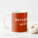 Una taza blanca y naranja con texto en blanco que dice "Los navegadores lo hacen con el mapa".