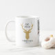 "Oh, los Navidades venados están aquí". Disfrute de este diseño moderno con una silueta de cabeza de ciervo dorado purpurina. La taza también cuenta con un lugar para que pongas una foto con un borde blanco en el interior de la imagen.