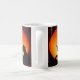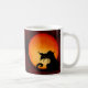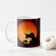 Un gato negro asustado con ojos naranjas frente a una gran luna llena de naranjas.