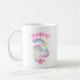 Una taza con un adorable unicornio blanco con una forma y un cuento de tonos verde pastel, violeta, amarillo y rosa. Esta mágica criatura está tumbada durmiendo pacíficamente con una estrella fugaz de color arcoiris volando sobre su cabeza. El texto dice "Café mágico" en una fuente de moda rosa.