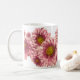 Esta encantadora taza decorativa presenta exquisitos crisantemos rosas. Los colores pétalos van desde un brillo pálido hasta un magenta profundo hacia el centro. Los centros son verdes y amarillos.