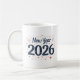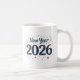 Celebra la llegada del 2026 cada mañana con esta taza de Año Nuevo! El diseño presenta números audaces de "2026" en azul marino, decorados con un patrón colorido de estrellas en amarillo, rojo y azul claro. Arriba, las palabras "Año Nuevo" aparecen en un elegante y fluido guión, rodeado de vibrantes fuegos artificiales rojos y amarillos. Los puntos de confeti y las estrellas se dispersan por el fondo blanco, lo que le da al diseño un ambiente divertido y festivo. Perfecto para tomar café, té o cacao caliente mientras suena el año nuevo - o como regalo para amigos y familia para empezar el 2026 con alegría!