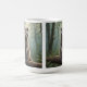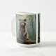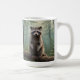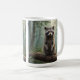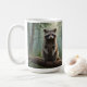 Esta taza presenta un adorable mapache en el bosque en una mañana brumosa.