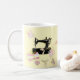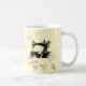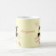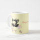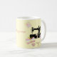 Diseño de una coser vintage con tejidos de color bonito, botones, bobinas de hilo y flores sobre un fondo crema. Una taza de café ideal para todos los amantes del coser y el tejido. Un regalo ideal para dar a su tejido o círculo de coser. Se puede personalizar cambiando el nombre.