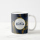 Café con un elegante y elegante fondo de mármol azul marino y dorado. En la parte superior hay un círculo con un borde de Relieve metalizado de oro falso con el texto personalizado en el interior.