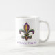 This ceramic coffee mug is shown with Mardi Gras images, Text of "Let the good times roll' is beneath the prints.