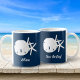 Personalice esta taza con temática costera para usted o un regalo, con un nombre a un lado y un dicho náutico "Mares el día" al otro. El diseño está formado por un dólar de arena blanca y dos estrellas de mar sobre un fondo azul marino. *Si necesitas ajustes de diseño o quieres más productos con este diseño u otros colores, por favor contacta conmigo a través de Zazzle.