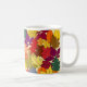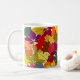 Esta taza tiene un diseño de un montón de hojas en verde, amarillo, naranja, azul, marrón y rojo en un campo de amarillo pálido.
