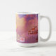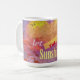 La pared, en la obra original de ZoeSPEAK en esta taza inspiradora, es una antigua pared de ladrillo rojo con un mural en estuco que se está desmoronando. El mural es una imagen de nubes esponjosas en el atardecer, todo rosa y amarillo brillante en la parte superior contra un cielo azul profundo. El mensaje es dejar que entre la luz del sol.