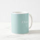 A modern minimalist personalized mug featuring a muted teal background, clean white lettering, and a subtle heart accent. Customized with a name, this design offers a calm, contemporary take on Valentine’s Day gifting while remaining perfect for everyday use.