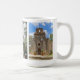 Diseño de taza único con Misión Espada, ubicado en San Antonio, Texas. Una fotografía del detalle intrincado sobre el diseño de la cruz de hierro forjado con árboles de foco suave y el cielo azul sutil detrás.