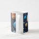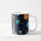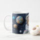 Wraparound white ceramic mug featuring a cute teddy bear astronaut in a white spacesuit, surrounded by colorful planets and stars on a deep navy galaxy background.
