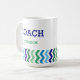 El modelo masculino personalizado de Chevron del coche entrena la taza. Modelo de los abrigos de la raya del galón alrededor de la base de la taza en verdes y azules. Personalice con nombre en fuente verde por debajo la palabra COCHE en azul. Grande para un coche de cualquier deporte. La taza personalizada de moda del coche de la escuela hace un gran regalo.