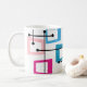 Esta taza tiene un diseño de rectángulos que se estiran en un extremo en colores vivos, naranja, verde, verde azulado, morado, azul, rosa y amarillo con líneas atómicas que los atraviesan.