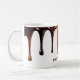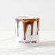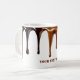 Este tazón de café presenta un diseño visualmente llamativo con ricas y lustrosas gotas negras y marrones que caen en cascada por la llanta superior, imitando el chocolate fundido o el café derramado sobre el borde. El personalizado audaz de un color marrón coincidente se sienta cerca de la base, donde se puede agregar, humor y carácter al diseño. Es perfecto para los amantes del café o para aquellos que disfrutan de una bebida única y artística. El texto puede ser reemplazado por su propio mensaje, o puede eliminarlo y dejarlo en blanco.
