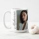 La taza de café Moment Vertical con Name presenta una imagen vertical de largo, emparejada con un nombre de guión vertical a lo largo de un lado. Con una base blanca y un texto negro, la elegante disposición editorial crea un diseño moderno y memorable inspirado en la estética de las revistas.