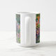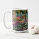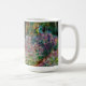 Un tazón de café con flores de Monet con hermosos iris rosados y morados en un jardín brillando bajo árboles altos. Un gran regalo de Monet para los amantes del impresionismo y del arte francés. Impresionismo natural pacífico con flores y paisajes pintorescos.