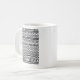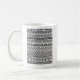 Enjoy your coffee with this striking black and white mug featuring a seamless textile sampler pattern. The design mimics stacked rows of bohemian knit and woven trims, including chevrons, waves, chains, and geometric stitching for a modern folk-art feel.