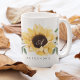Elegante tazón de café personalizado de girasol de estilo rústico. Nuestro diseño presenta nuestra acuarela pintada a mano girasoles dorados amarillos, flores de crema blanca, y vegetación natural que se ha dispuesto para crear este elegante arreglo de estilo rústico. Nuestros girasoles amarillos florales se envuelven alrededor de la taza de café. Personalizar con su nombre y monograma. Todas las flores están pintadas a mano por Moodthology Papery.