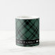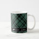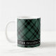 Personalice a este Navidad festivo el café o la taza de cacao caliente con el nombre de su familia y la fecha fijada (año en que nació el primer hijo o casado) u otro texto personalizado. El diseño presenta un fondo clásico y moderno de color escocés escocés, con motivos estampados de cazador/pino verde y negro. El fondo verde se puede personalizar a cualquier otro color que prefiera.