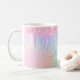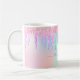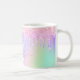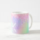 Un fondo holográfico de moda con colores pastel de unicornio y arcoiris en rosa, violeta, dorado rosa, verde menta. Decorado con goteo falso purpurina en oro rosa, rosa y morado. Personalice y agregue sus iniciales y nombre de monograma. Letras moradas y blancas. El nombre está escrito con un guión moderno de estilo con letras a mano con toques. Para que los cambios sólo eliminen el nombre del ejemplo, deje los espacios o la emoji delante y después del nombre. ¡Un poco de luz diaria para alegrar el día!