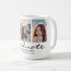 Esta taza de café es perfecta para un regalo de graduación. La plantilla de diseño incluye 3 fotos para que cambies a la tuya propia. Debajo se lee "Graduado" en un moderno guión negro con tu nombre, escuela y año para que puedas personalizar. Diseñado por la artista ©Susan Coffey.