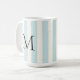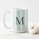 Una taza personalizada con un audaz monograma negro sobre rayas verticales azul claro y blanco roto, este diseño se ha visto muy bien con una decoración de estilo contemporáneo y vintage.