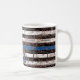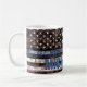 Este tazón de café con la delgada línea azul de la bandera estadounidense afligida es un gran regalo para los oficiales. Personalice reemplazando el nombre de la muestra y el número de la placa por el nombre y número de la placa de su propio funcionario. Diseñado por la artista de renombre mundial ©Tim Coffey.