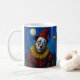 Payrot de porcelana brillante de payaso con traje de polka-punto rojo bajo la luz de la luna en la taza, ideal para coleccionistas o regalos artísticos. Esta singular taza cuenta con un payaso Pierrot de estilo porcelano brillante situado en una calle nublada iluminada por la luna. Con una expresión dolorosa, lágrimas pintadas y una nariz roja brillante, el payaso lleva un gorra puntiagudo y un collar ricamente texturado. Su traje rojo con polka azul resplandece bajo la lámpara, realzado por un suave efecto cerámico que le da vida a todos los detalles. Perfecto para el café, el té o como pieza decorativa, esta taza es un regalo sorprendente para coleccionistas de arte, entusiastas del circo, o para cualquiera que ame la monotonía, los diseños teatrales.