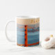 La imagen muestra el puente Golden Gate con el horizonte de San Francisco al fondo. El puente es una importante estructura naranja, con sus cables que se extienden a través del agua azul. El horizonte de la ciudad está iluminado por la cálida luz del sol. Varios veleros saltan al agua, añadiendo a la vista panorámica. El cielo está despejado con un degradado de tonos azul claro y naranja.