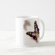 Mariposa muy colorida sobre un fondo blanco con sombras. La mariposa es negra con mezcla de rosa caliente, verde y blanco.