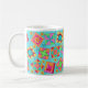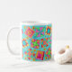 El arte de la cintura, basado en el arte original, presenta bloques de edredón de mosaico de mosaico patchwork favoritos, además de bloques únicos creados en colores dinámicos rosa, naranja, amarillo y verde y arrojados sobre un fondo turquesa acuático. Muestra tu amor por el tejido con estos diseños mientras bebes tu bebida favorita en esta taza. Personalizable completo.