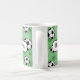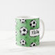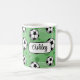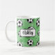 ¡Un personalizado de tazas de fútbol verde personalizado impreso con tu nombre! Está diseñado con un patrón de balones de fútbol y goles sobre un color de fondo verde con círculos verdes que rodean la taza. Tu nombre, cuando se personaliza, se imprime a ambos lados de la taza sobre el patrón de fútbol verde. Hace un gran regalo para el hincha de fútbol en tu vida.