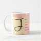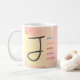 Esta taza será la favorita para todos, desde tu dulce abuela hasta tu hermana adolescente. Con el mensaje correcto, una taza puede convertirse en la más atesorada compañera de cualquiera en los próximos años. Este diseño presenta una hermosa letra a mano "J" en cursiva negra sobre un impresionante fondo acuático. El lado izquierdo muestra un gradiente cálido de amarillo a rosa, mientras que el lado derecho muestra un gradiente suave de rosa a amarillo. Alrededor de la carta hay palabras vibrantes de varios colores, incluyendo azul, naranja, rojo, morado y rosado, destacando rasgos positivos empezando por la letra "J". El efecto general es un diseño visualmente atractivo y edificante que celebra la belleza de la letra "J" y sus cualidades asociadas. El fondo acuático añade un toque de elegancia y sofisticación, haciendo que este diseño sea perfecto para propósitos inspiradores o motivacionales.