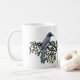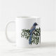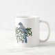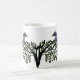 Judías azules encaramados sobre ramas de árbol. Los pájaros se enfrentan unos a otros desde lados opuestos de la taza. Las ramas y hojas son de color verde oscuro,