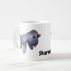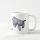 muñeca de perro creada en crochet. Rayas grises y blancas, ojos negros, lengua rosa. Imagen de perro a cada lado de la taza mirando al centro. En el centro inferior, personalizar un nombre.