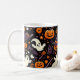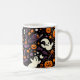 Esta taza temática de Halloween presenta un diseño lúdico de fantasmas, calabazas, estrellas, lunas y otros símbolos espeluznantes. Ideal para añadir un toque mágico a tu café matutino o al cacao caliente.