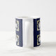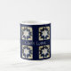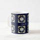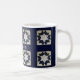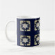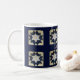 A section of a single quilt block is tiled on a dark blue background.. Text "Quilt Lover" in white script. Block: Quilted yellow, white and dark blue "Star flower" pattern. The central "star" is a white with dark yellow ducks. This is surrounded by "petals" of dark blue with red, blue and yellow flowers. Surrounding that is yellow and white gingham check.