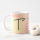 Esta taza será la favorita para todos, desde tu dulce abuela hasta tu hermana adolescente. Con el mensaje correcto, una taza puede convertirse en la más atesorada compañera de cualquiera en los próximos años. Este diseño presenta una hermosa letra a mano "T" en cursiva negra sobre un impresionante fondo acuático. El lado izquierdo muestra un gradiente cálido de amarillo a rosa, mientras que el lado derecho muestra un gradiente suave de rosa a amarillo. Alrededor de la carta hay palabras vibrantes de varios colores, incluyendo azul, naranja, rojo, morado y rosado, resaltando rasgos positivos empezando con la letra "T". El efecto general es un diseño visualmente atractivo y edificante que celebra la belleza de la letra "T" y sus cualidades asociadas. El fondo acuático añade un toque de elegancia y sofisticación, haciendo que este diseño sea perfecto para propósitos inspiradores o motivacionales.