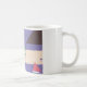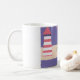 Esta clásica taza blanca está diseñada con una representación artística en papel de una escena de playa con un faro de rayas rojas y un océano azul con veleros