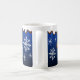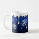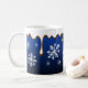 El chocolate caliente está goteando por esta festiva taza de copo de nieve azul profundo. Los diseños son de arte original.