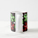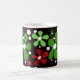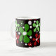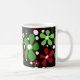 Flores funky verdes y rojas con puntos de polka blanco sobre fondo negro.